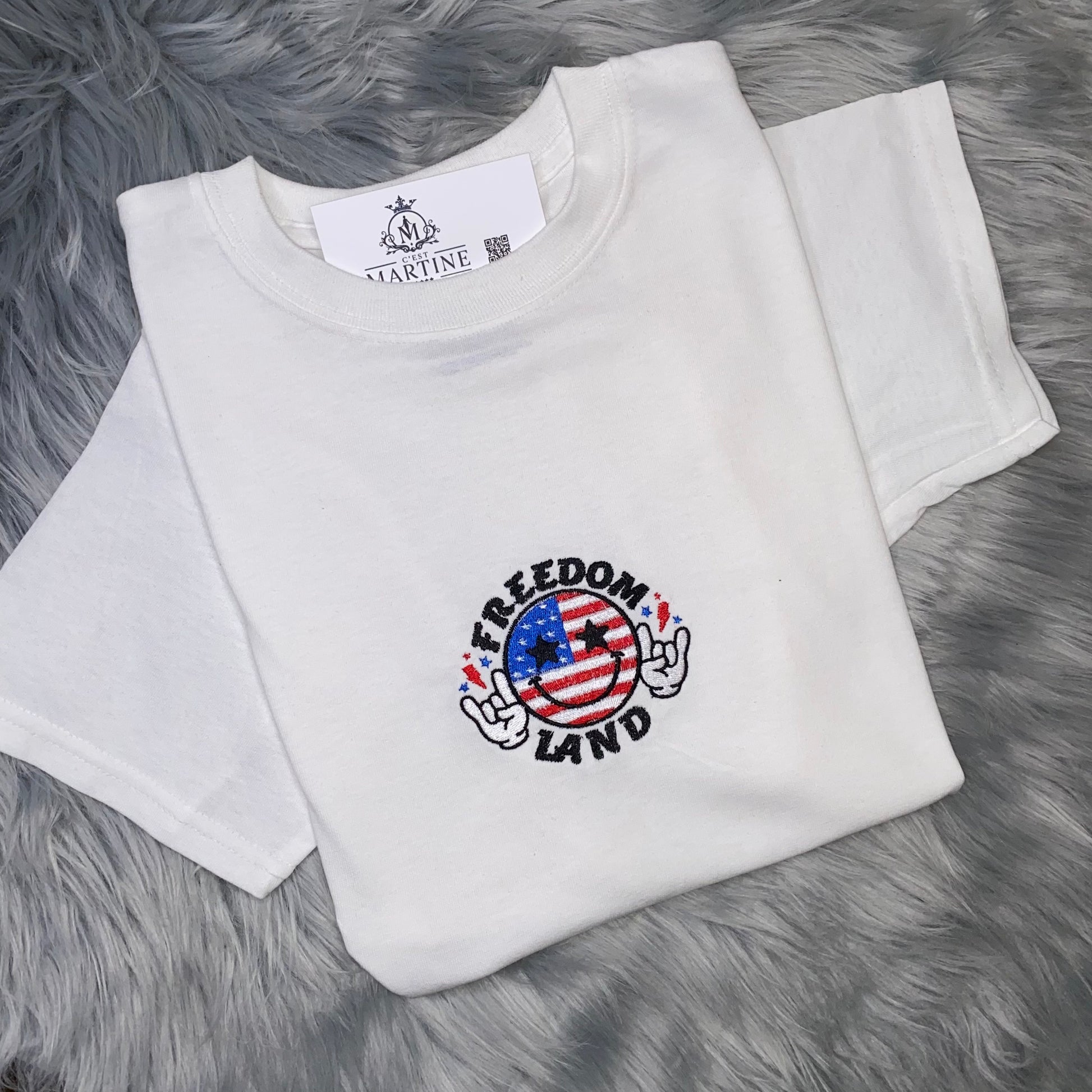 4th of July, Smiley Face, All American, Freedom, Land of the Free, America Embroidered, Custom T-Shirt, Church Going