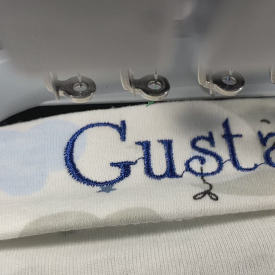 This personalized baby boy layette includes a cloud style bodysuit, pants, bandana bib, socks, mittens ensemble, and a mini baby garment bag. All items are customizable with a baby's name embroidered on the hat. The bodysuit can also be embroidered for a son or a daughter. Gift this newborn baby layette for a special baby shower present. Available in pink, blue, and mint green.